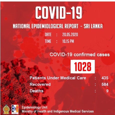 அதன்படி நாட்டில் கொரோனா நோயாளிகளின் எண்ணிக்கை 1028 ஆக அதிகரித்துள்ளதாக சுகாதார அமைச்சு தெரிவித்துள்ளது.